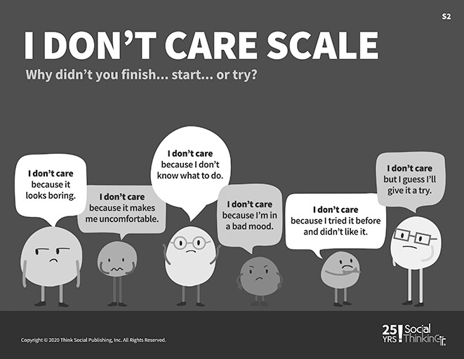 Finley, age 14 and Autistic, was scheduled to come to our office for a Social Thinking Dynamic Assessment. His mom called to warn us that he very likely would not participate and mostly responds to all tasks with, “I don’t care.” We’ve worked with hundreds of tweens and teens whose immediate response is to “not care,” so we prepared a Likert-type scale that listed many different reasons we’ve heard this response during assessment or teaching sessions. On the left side of the scale was, “I don’t care because it looks boring.” On the right side was, “I don’t care, but I’ll try it anyway.”