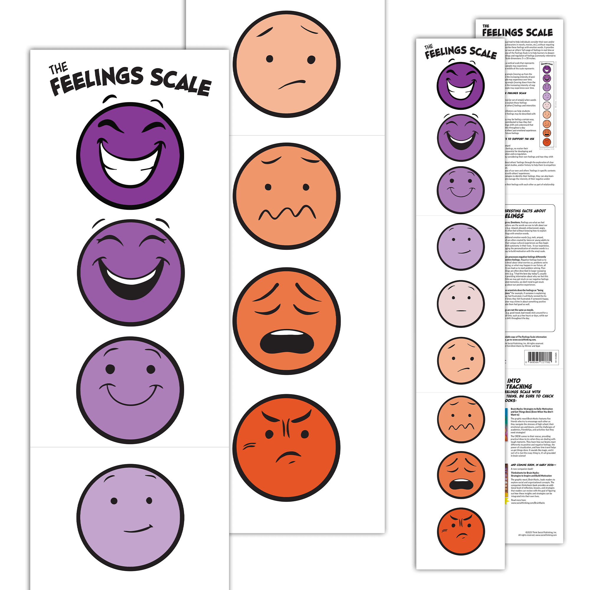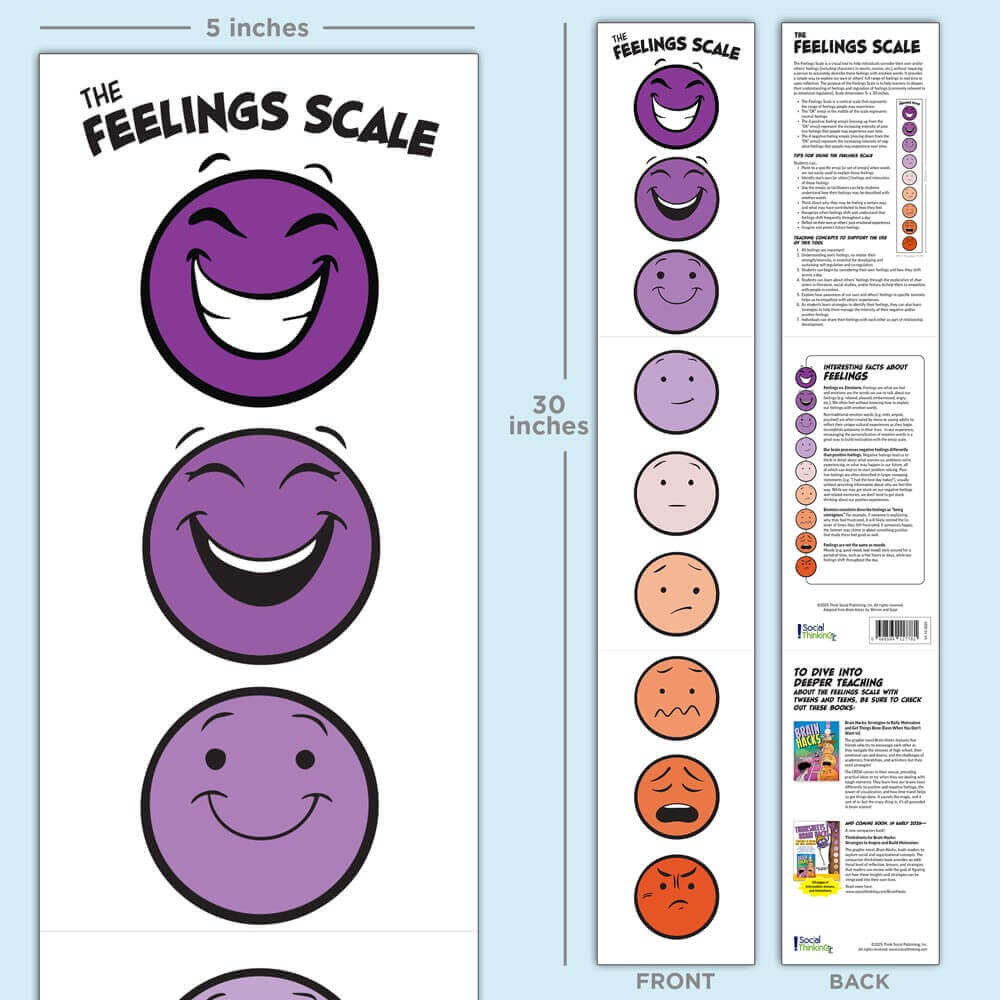The Feelings Scale is a simple visual tool that uses nine emojis to help individuals explore a full range and intensity of their feelings without needing specific emotion words. The back of the scale and an accompanying hidden webpage provide tips, facts, and teaching concepts to support emotional understanding and regulation.
