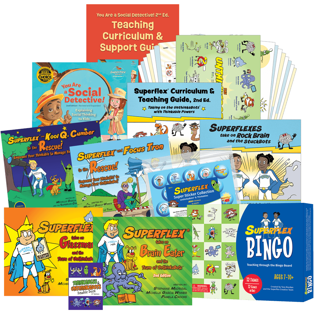 Welcome to the Superflex® Universe where students learn to become their own social superheroes—observing situations, interpreting clues, taking perspective, social problem solving, and using metacognitive strategies to self-regulate to meet their social and academic goals. Get the entire Superflex Series collection, featuring all sorts of teaching tools from our Dynamic Duo (Social Detective and Superflex). This collection has two curriculum and teaching guides, six supplementary storybooks, two teaching card decks, stickers, and two educational games. Social Detective and Superflex lessons make learning about social attention, social problem solving, and self-regulation fun. The entire Superflex Series is designed to empower all neurotypes to boost their own inner “Superflex powers.” A good choice for both schools and clinics.