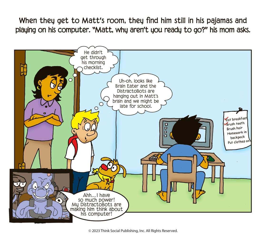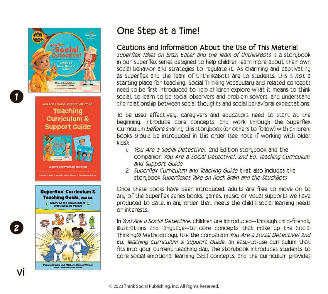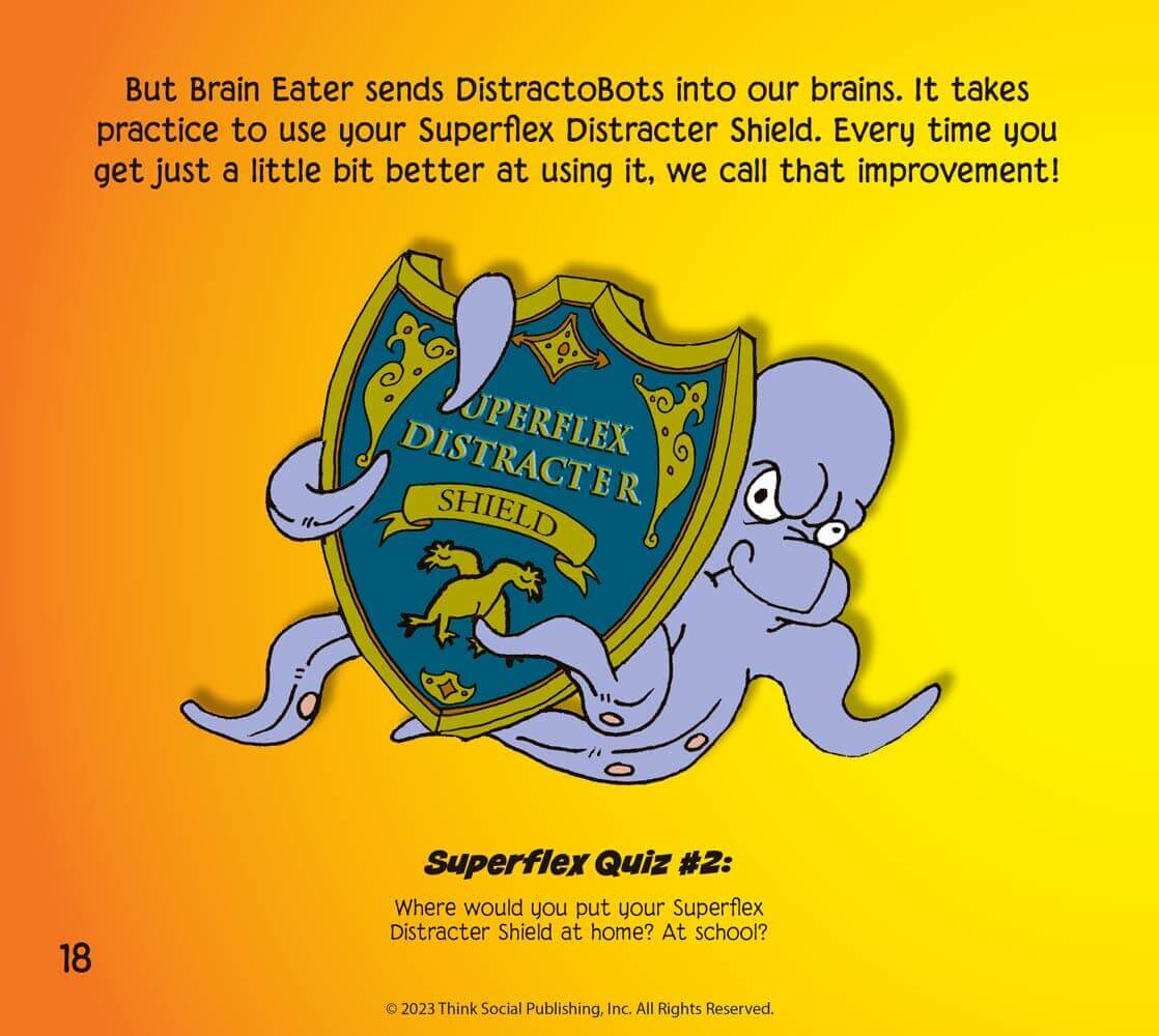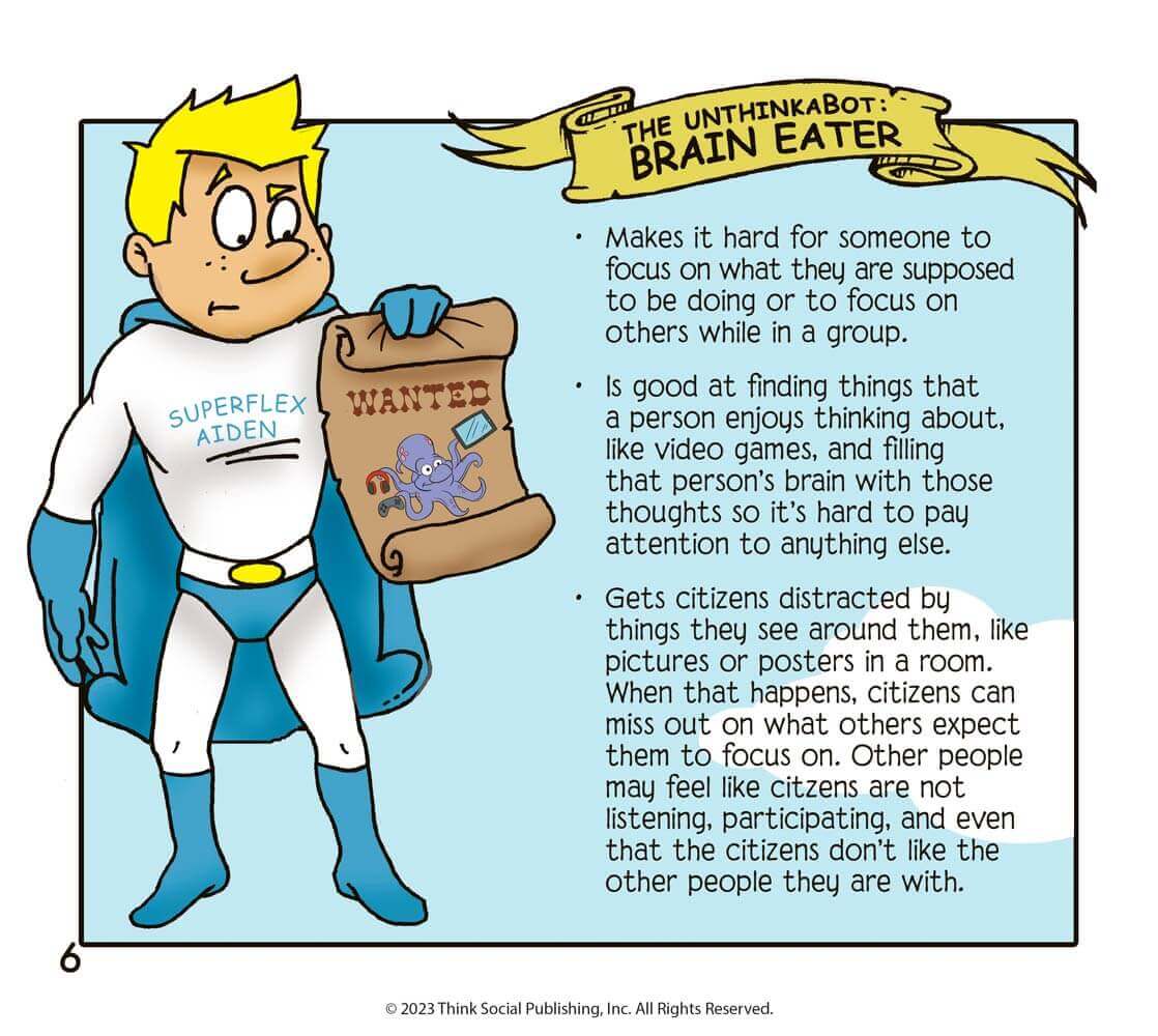 Superflex Takes on Brain Eater and the Team of UnthinkaBots, 2nd Edition introduces readers to the UnthinkaBot Brain Eater who uses attention-grabbing powers (DistractoBots) to distract Social Town citizens’ brains from focusing. Brain Eater can pull our attention away from what we are supposed to be doing, what others are talking about, or using our brains to focus on things at school or home. In this storybook, Aiden is a boy who sees his classmates having trouble focusing on getting ready for school learning in class. Aiden transforms himself into Superflex Aiden and joins readers on a journey to the Superflex Academy. This storybook is part of our Superflex Series, which is designed to help children learn about their own strategies for self-awareness and self-regulation across a variety of situations.