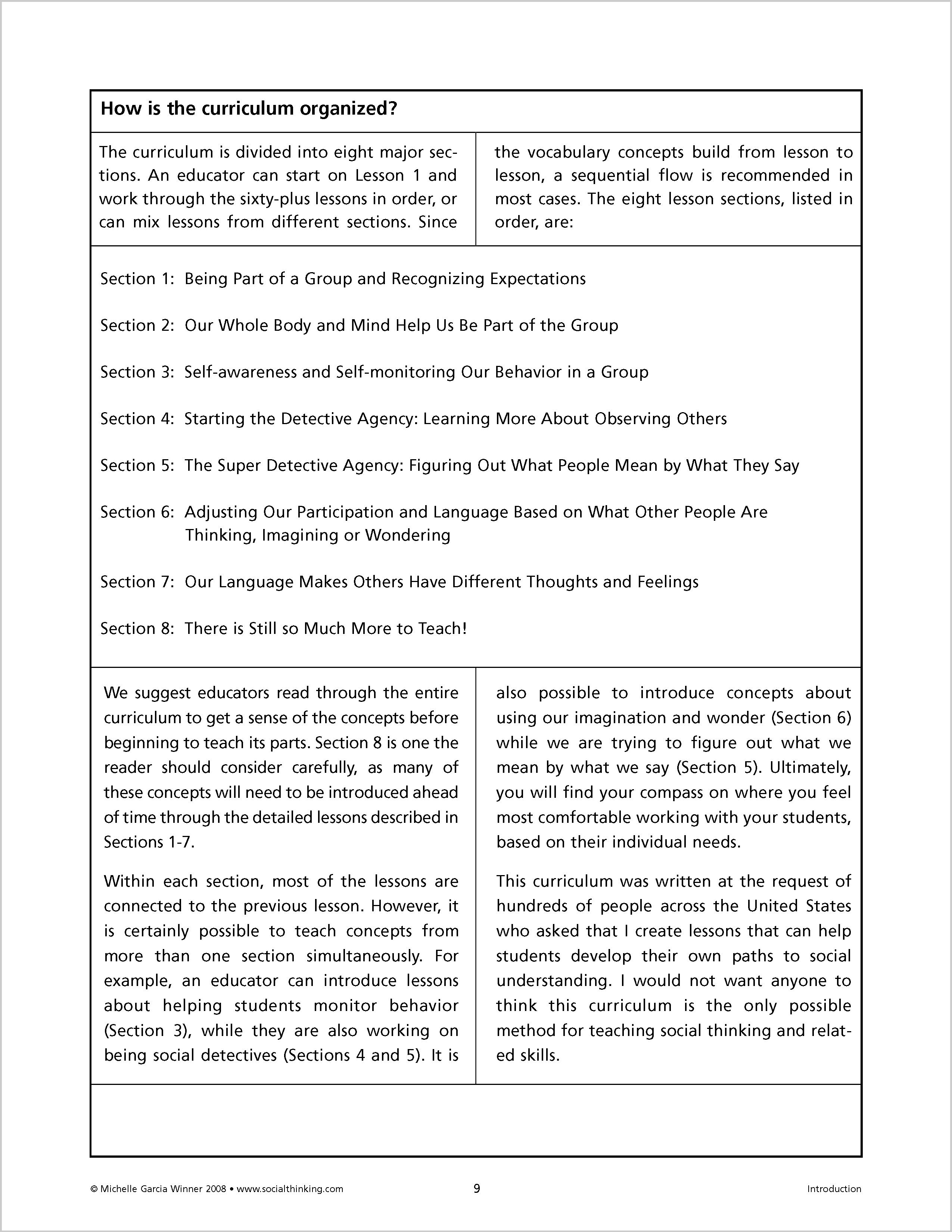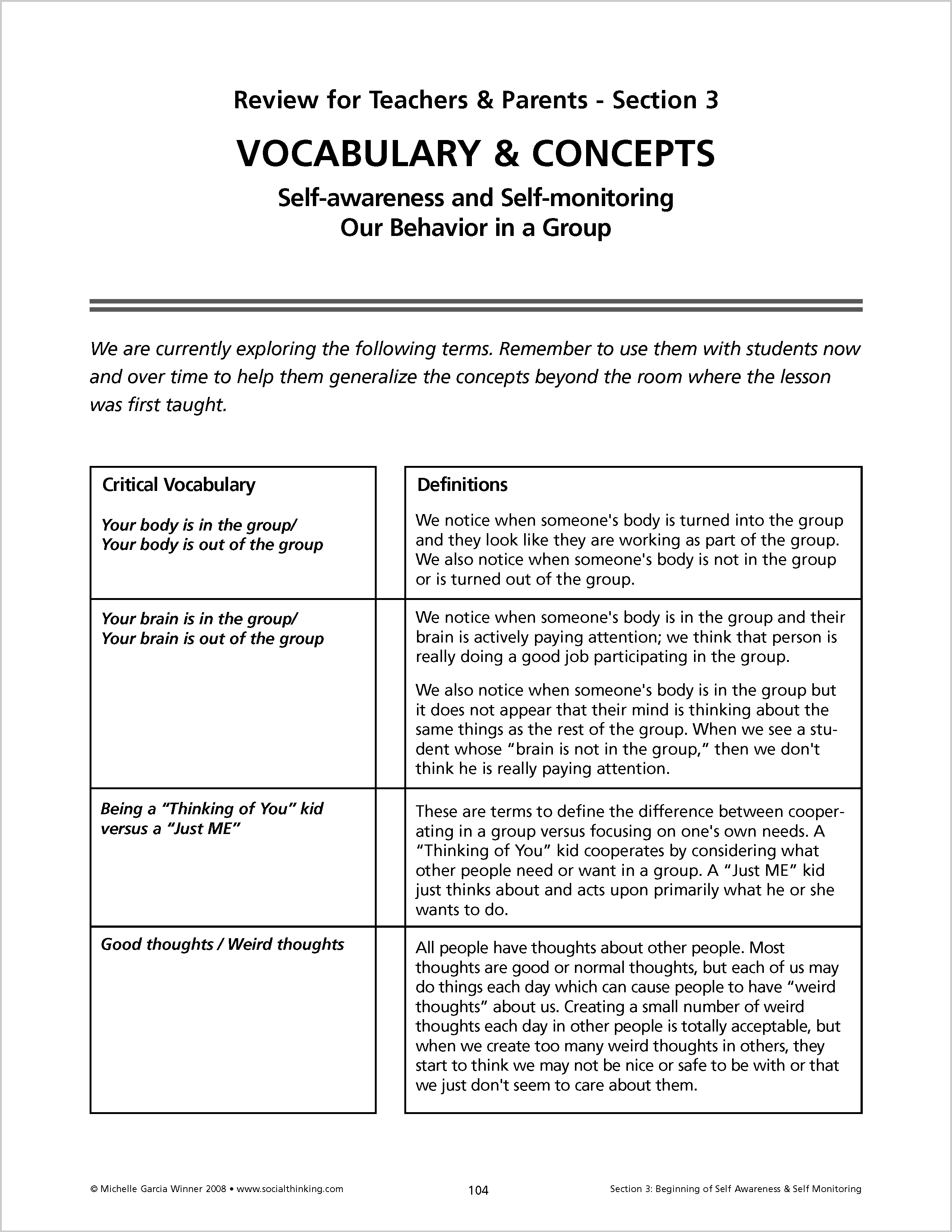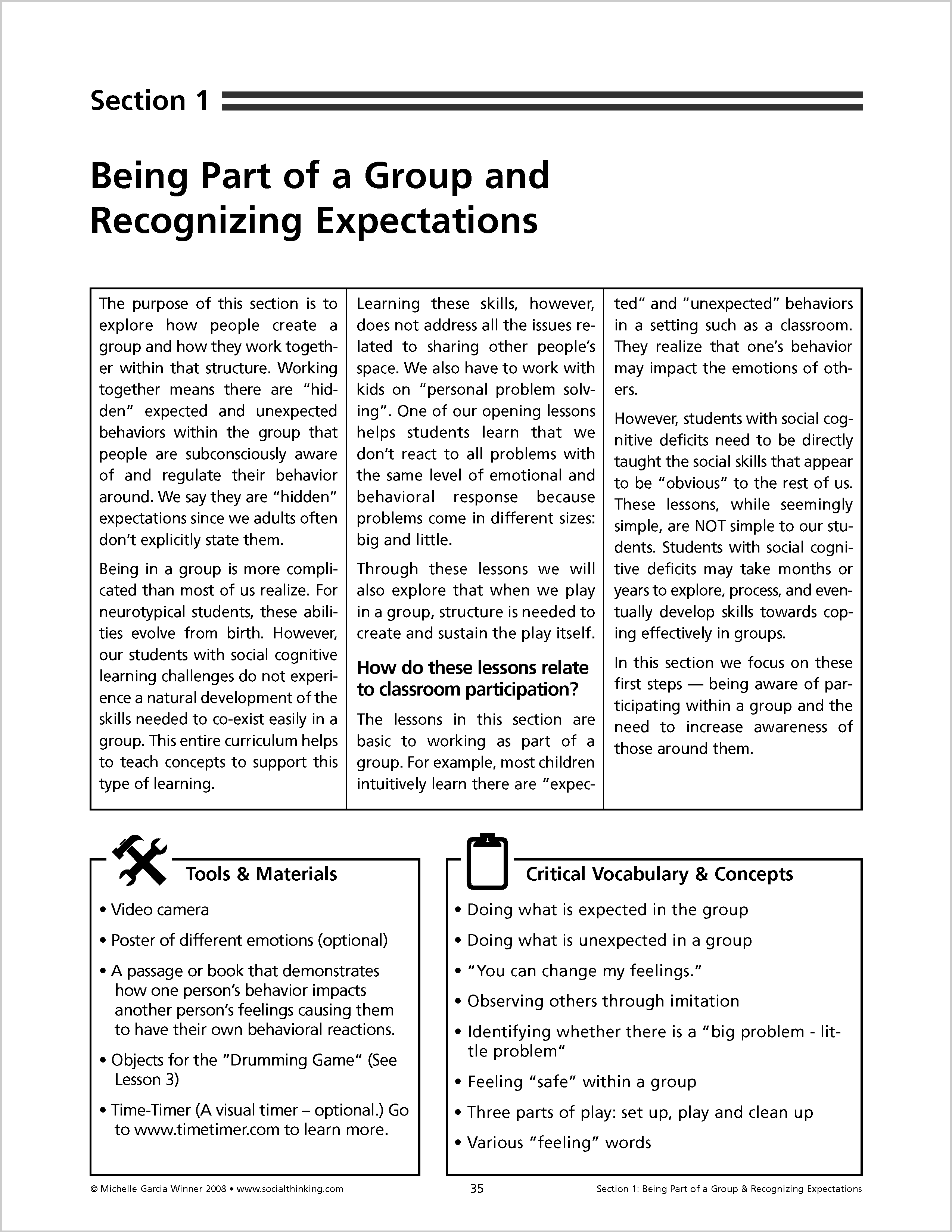 Lessons in Think Social! begin by teaching Social Thinking Vocabulary. A summary of each chapter provides relevant Social Thinking Vocabulary to use during "teachable moments.” Each chapter concludes with ideas for goal suggestions and also provides a list of educational standards, linking social thinking and academics. The curriculum provides a comprehensive introduction to guide people through applying the lessons to developing social thinking groups.