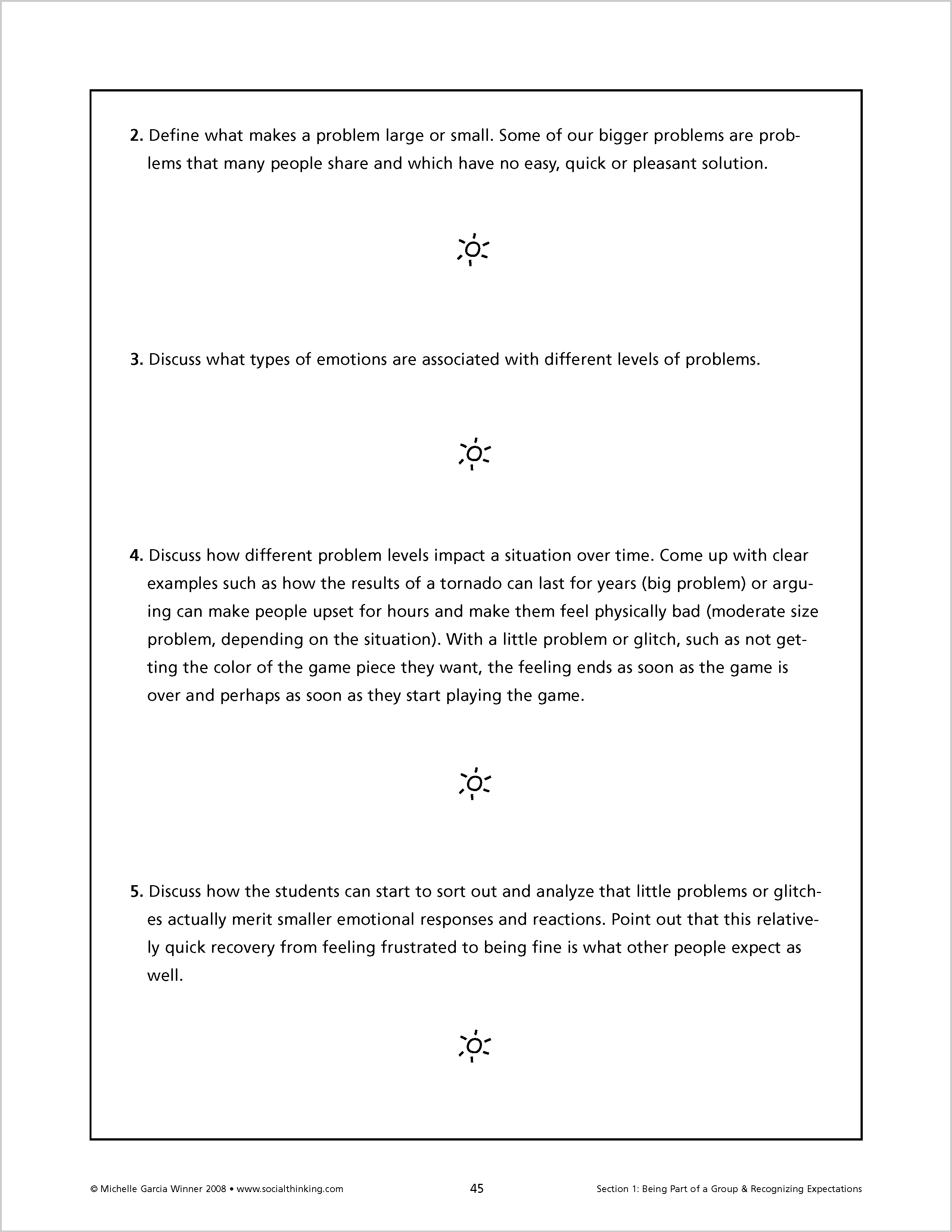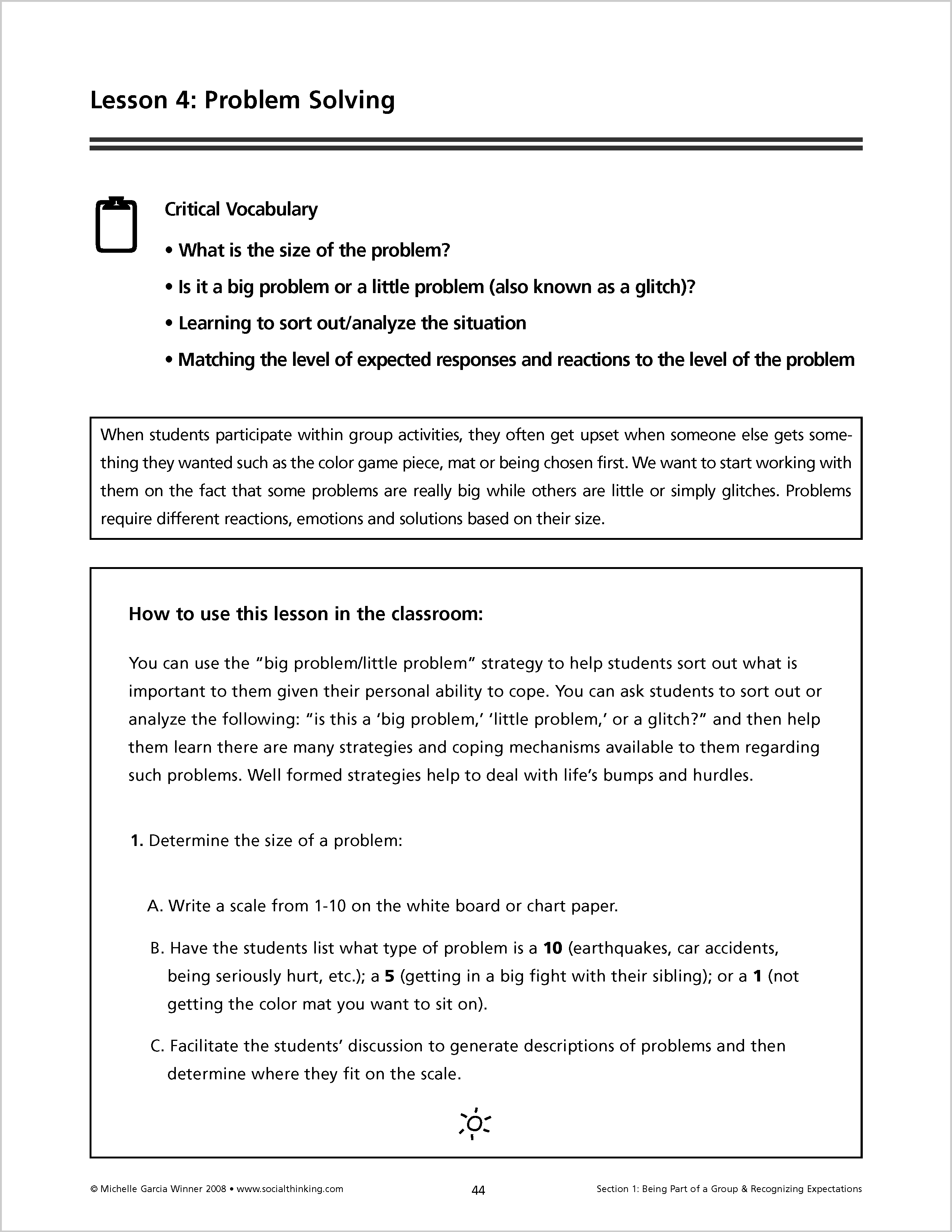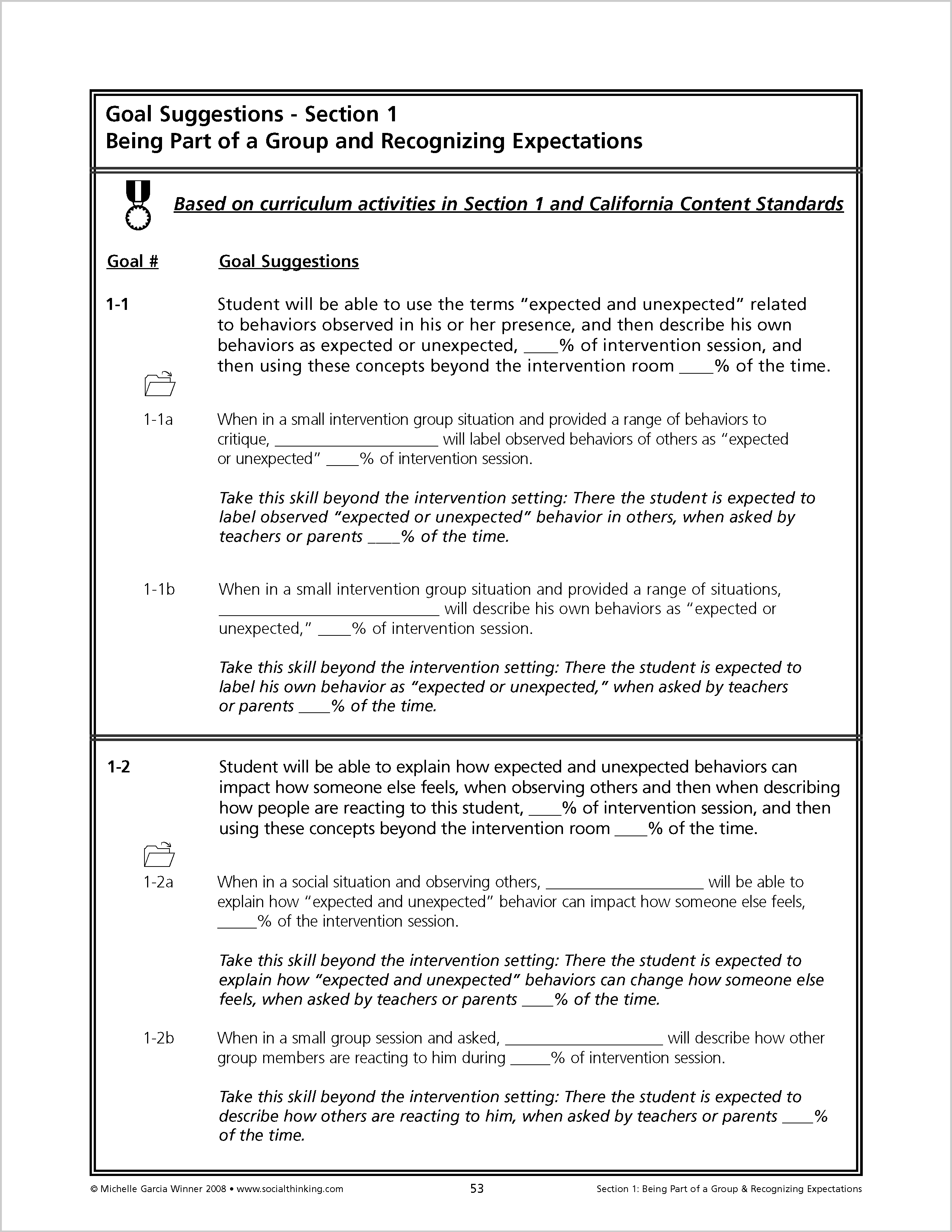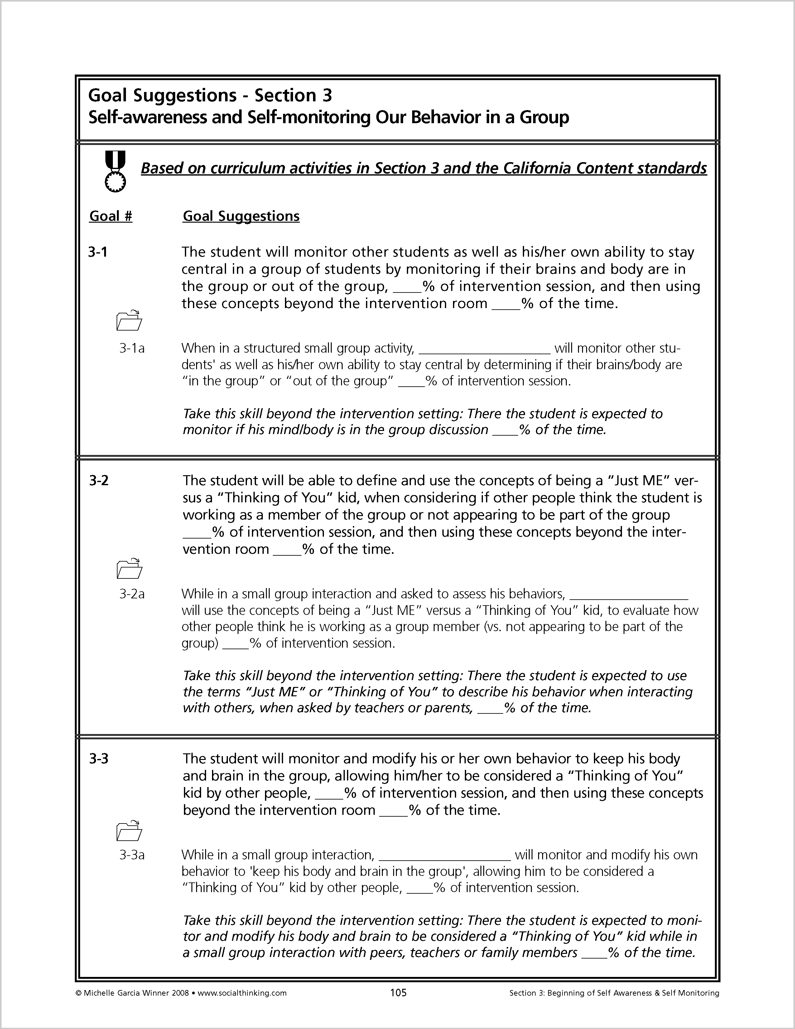 Lessons in Think Social! begin by teaching Social Thinking Vocabulary. A summary of each chapter provides relevant Social Thinking Vocabulary to use during "teachable moments.” Each chapter concludes with ideas for goal suggestions and also provides a list of educational standards, linking social thinking and academics. The curriculum provides a comprehensive introduction to guide people through applying the lessons to developing social thinking groups.